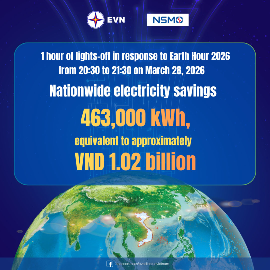 According to data from the National System and Market Operation Company (NSMO), after one hour of lights-off during Earth Hour 2026, the entire country saved 463,000 kWh of electricity, equivalent to approximately VND 1.02 billion [1].