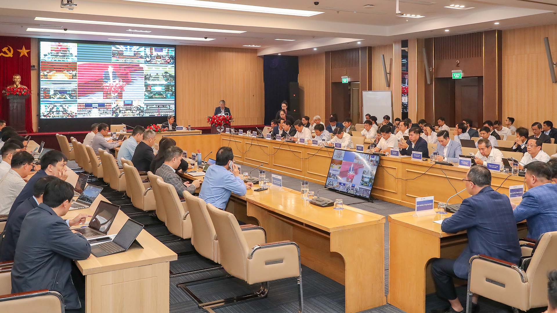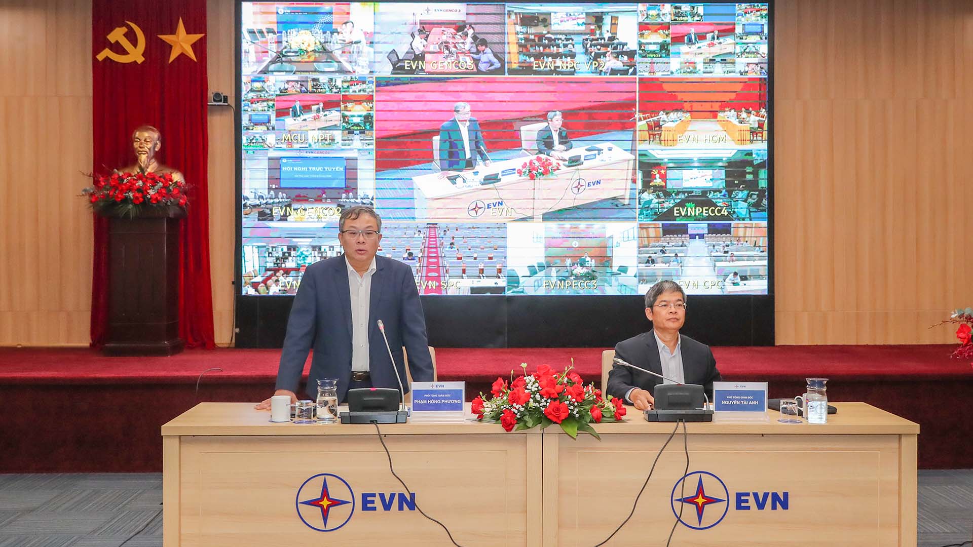 Phó Tổng giám đốc EVN Nguyễn Tài Anh (bên phải) và Phó Tổng giám đốc EVN Phạm Hồng Phương đồng chủ trì hội nghị. Ảnh: Ng.Tuấ