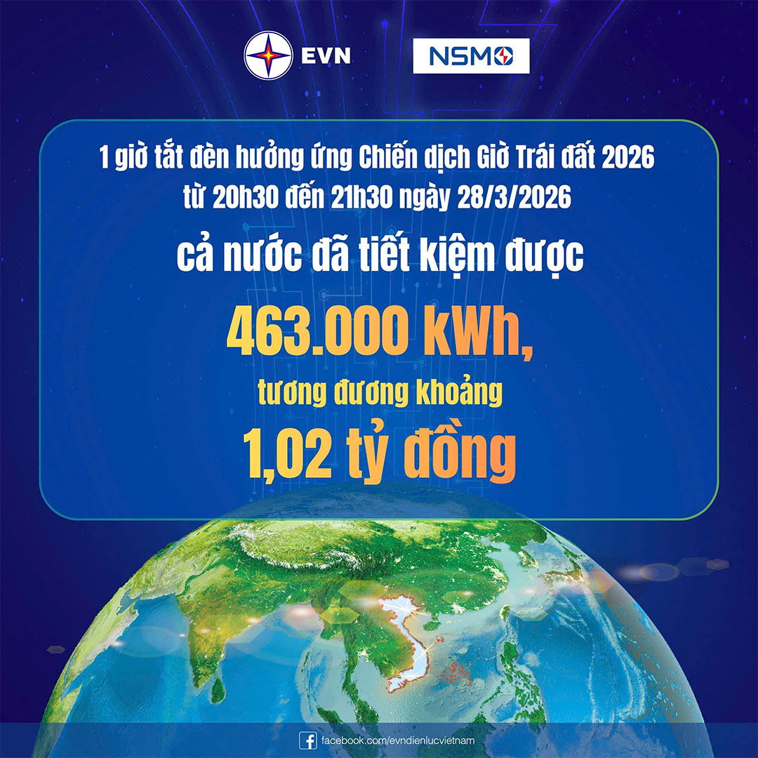 Theo thông tin, số liệu từ Công ty Vận hành hệ thống điện và thị trường điện Quốc gia (NSMO), sau 1 giờ tắt đèn hưởng ứng Chiến dịch Giờ Trái đất 2026 (từ 20h30 đến 21h30 ngày 28/3/2026), cả nước đã tiết kiệm được lượng điện năng là 463.000 kWh, tương đương khoảng 1,02 tỷ đồng [1].