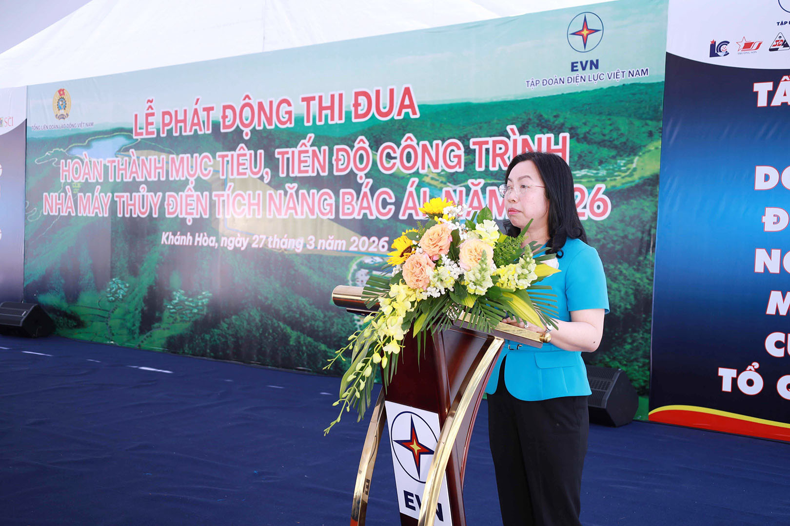 Về phía Tổng LĐLĐ Việt Nam, Phó Chủ tịch Thường trực Tổng LĐLĐ Việt Nam Thái Thu Xương cho biết, hưởng ứng phong trào thi đua do Thủ tướng Chính phủ phát động về phát triển kết cấu hạ tầng đồng bộ, hiện đại, thực hành tiết kiệm, chống lãng phí, Tổng LĐLĐ Việt Nam đã phối hợp với Tập đoàn Điện lực Việt Nam ký kết chương trình phát động thi đua đẩy nhanh tiến độ các công trình trọng điểm của EVN năm 2026 với chủ đề: “Tăng tốc thi công – Giữ vững an toàn – Bảo đảm chất lượng – Quyết tâm về đích” trong đó Nhà máy Thủy điện tích năng Bác Ái là công trình có vị trí đặc biệt quan trọng.