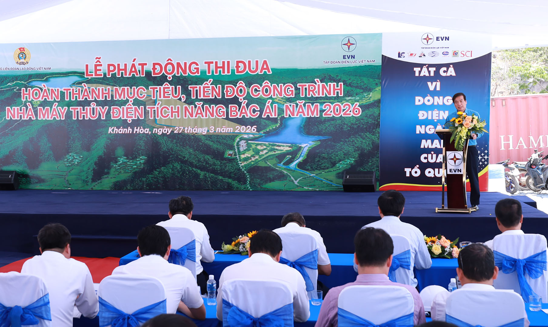 Sáng 27/3, tại công trường Dự án Nhà máy Thủy điện tích năng Bác Ái (xã Bác Ái Tây, tỉnh Khánh Hòa), Tổng Liên đoàn Lao động Việt Nam phối hợp với Tập đoàn Điện lực Việt Nam (EVN) tổ chức Lễ phát động thi đua hoàn thành mục tiêu, tiến độ công trình Nhà máy Thủy điện tích năng Bác Ái năm 2026.